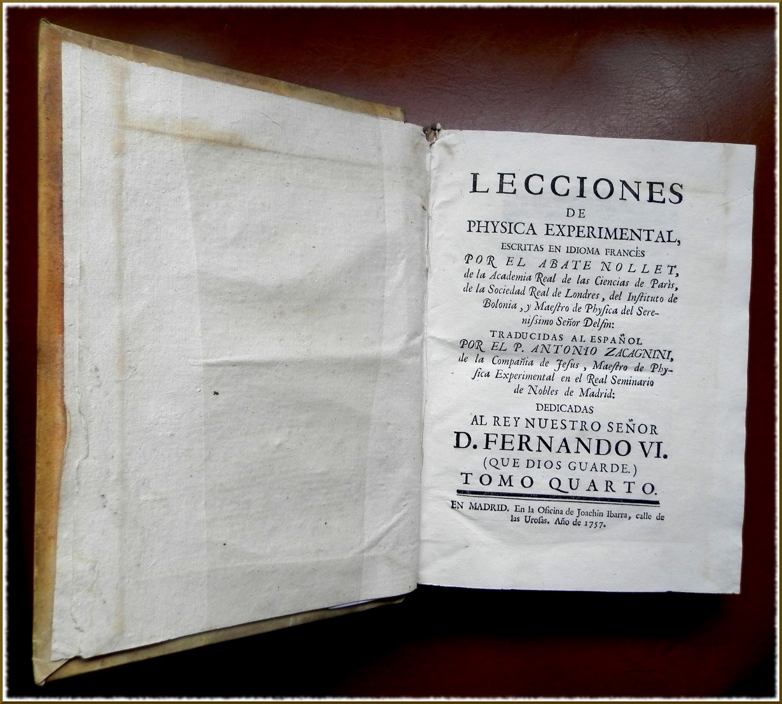 Obra de referencia para Viera y Clavijo en sus estudios científicos fue Leçons de Physique Experimentale, de Nollet, cuya primera edición en español les mostramos en esta exposición. El abate francés Jean-Antoine Nollet (1700-1770) fue el gran divulgador de las teorías y experiencias que sobre electricidad se habían realizado desde el siglo XVII. Con sus diferentes obras abrió un campo que, hasta aquel momento, estaba vedado a un estrecho círculo de entendidos. Con Nollet, la física, aparte de entrar en las escuelas y universidades, se puso de moda entre las élites ilustradas, siendo tema de conversación en las cortes reales y aristocráticas, que se convirtieron en escenario y público de experimentos científico-recreativos. Viera participa plenamente de este mundo; primero, en las reuniones de la Tertulia de Nava –donde posiblemente conoció por primera vez Leçons– y, especialmente, luego durante su estancia en París, donde realizó cursos sobre física y adquirió valioso material de laboratorio, para su gabinete del palacio del Marqués de Santa Cruz. Allí, en Madrid, tal y como había visto en sus viajes por Europa, efectuó distintas experimentos para recreo de la alta sociedad madrileña.