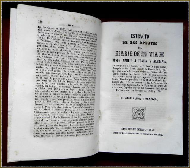 Los viajes que realizó Viera y Clavijo por Europa, entre 1777 y 1781, los describió en dos deliciosos relatos manuscritos impresos por primera vez en esta edición de 1849, de la Imprenta Isleña.