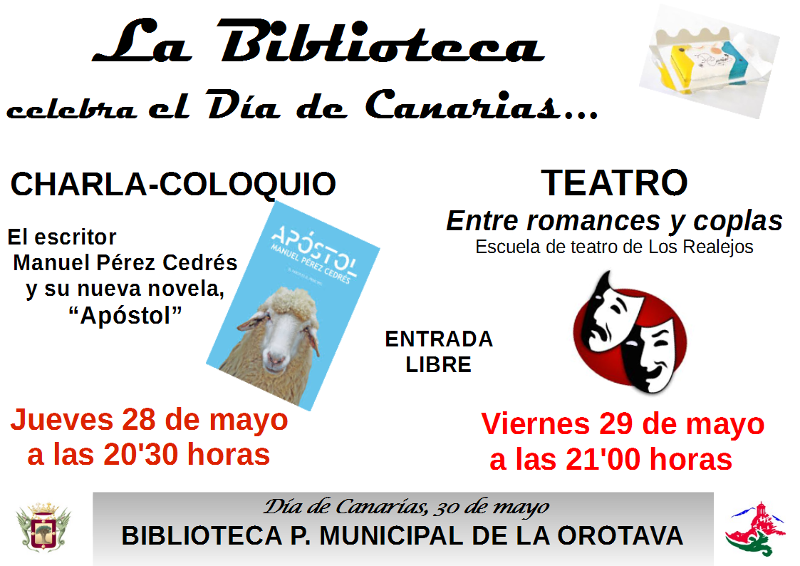 El pasado mes de mayo de este año, la Biblioteca programó 2 actos para celebrar el Día de Canarias: una charla con un escritor canario invitado y una obra de teatro.