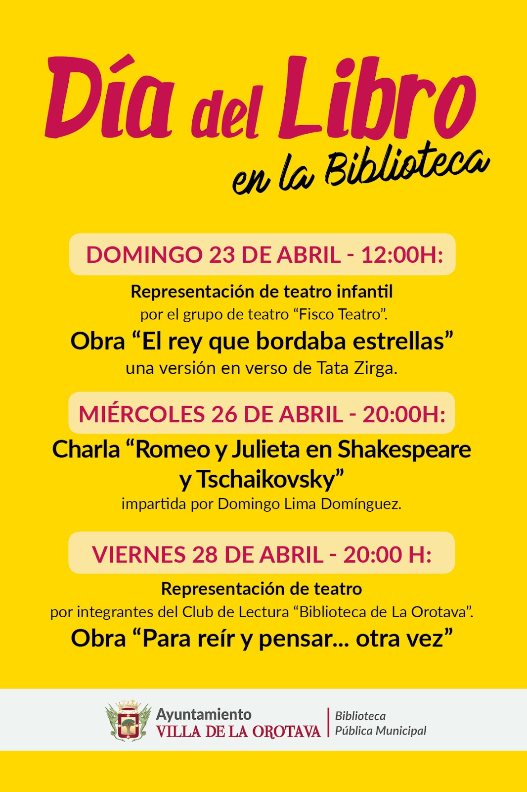 La Biblioteca Pública Municipal de La Orotava ya prepara las actividades que se han programado este año para celebrar el próximo Día del Libro. El escenario ya está listo para albergar las dos obras de teatro y se ha ambientado la biblioteca con paneles de las últimas novedades adquiridas, algunas de ellas relacionadas con dichas actividades.